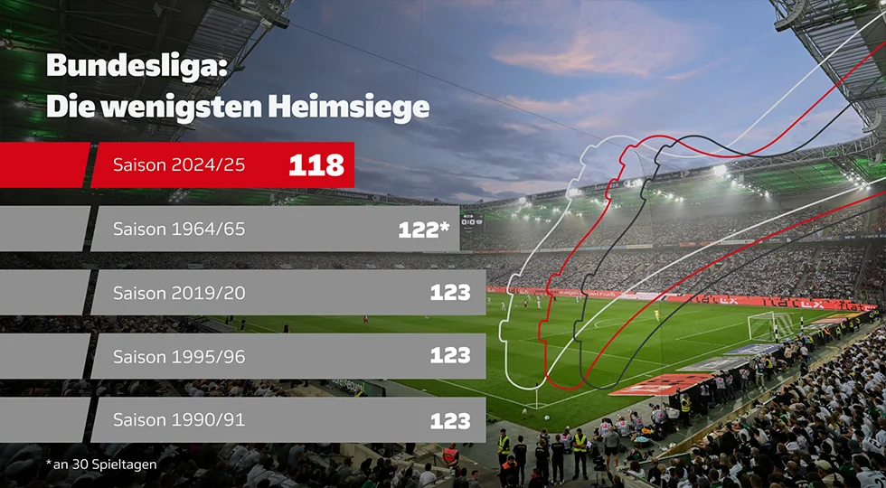 In der Saison 2024/25 gab es fast so viele Auswärtssiege (111) wie Heimsiege (118). In der Bundesliga-Historie gingen die Gästeteams nur in der „Corona-Saison“ 2019/20 noch öfter als Sieger vom Platz (115 Mal). Besonders beeindruckend: Bayer 04 Leverkusen blieb 2024/25 in der zweiten Spielzeit nacheinander auswärts ohne Niederlage.