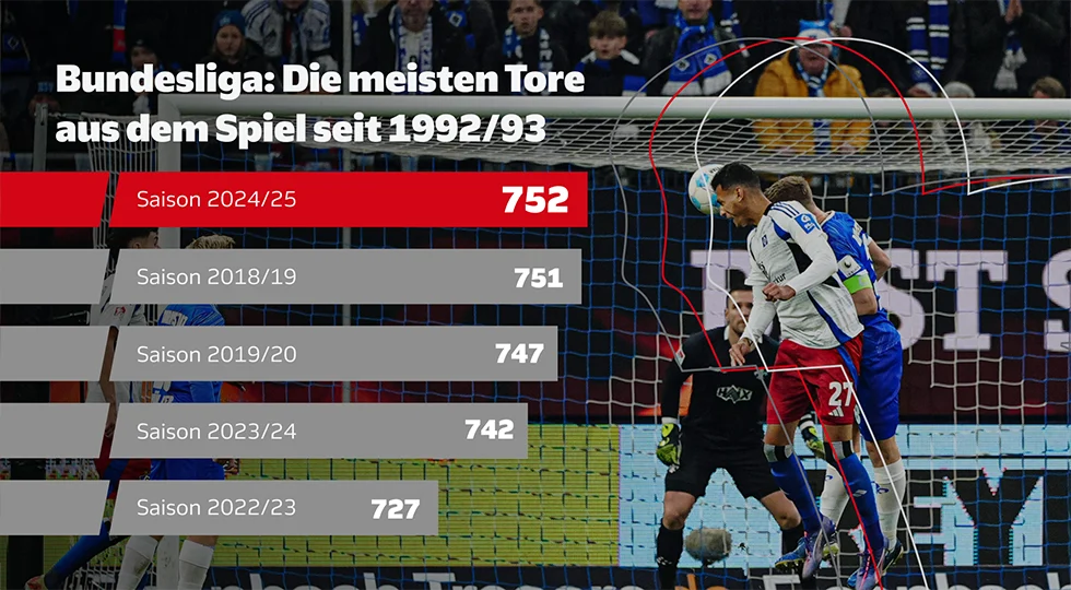 Im deutschen Profifußball werden Tore besonders häufig mit dem Kopf erzielt. In der 2. Bundesliga fielen 16,8 Prozent aller Treffer per Kopfball, in der Bundesliga waren es 15,8 Prozent. Diese Quoten sind höher als in den anderen europäischen Top-Ligen. Kein anderer Verein war in der Saison 2024/25 per Kopf so gefährlich wie der Hamburger SV. Die Rothosen erzielten 21 ihrer 78 Saisontore per Kopf.